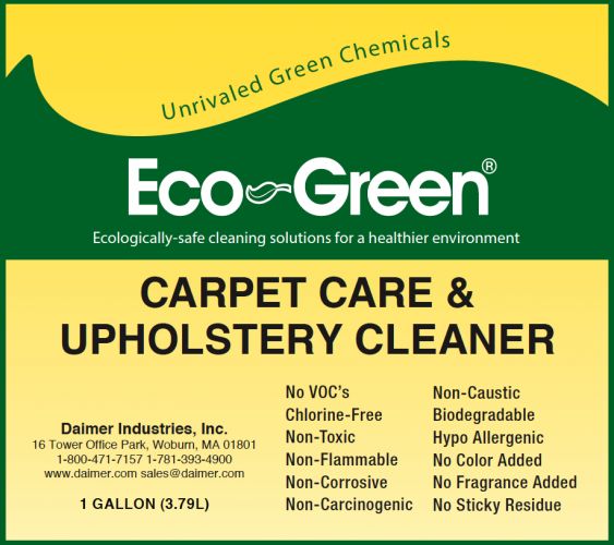 Daimer, a leading supplier of green chemicals, offers Eco-Green® Carpet Care & Upholstery Cleaner, a fast-acting, all-natural, cleaning formula that penetrates stains in carpets and upholstery using cutting edge green chemistry. This highly effective carpet cleaning formula works to deep clean and remove stains from carpeting without the use of harmful spot cleaning liquids. Eco-Green® meets OSHA standards.