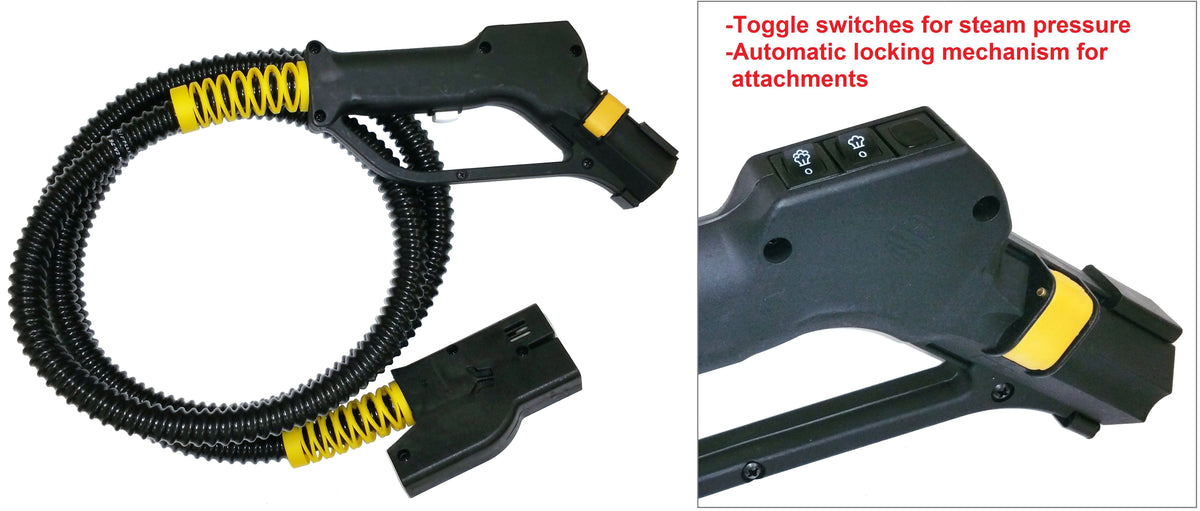 The steam hose with handgrip allows for brushes and other attachments such as squeegees and extension rods to be connected to the machine. The handgrip provides a comfortable control over the hose. Please see the image to make sure your old hose matches up to the one in the picture. (For the CURRENT LINE of the KleenJet® Pro Plus 200 and 300 models with the controls on the handgrip)