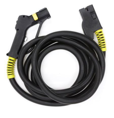 The Steam Hose with Handgrip makes attaching accessories including brushes, scrapers, squeegees, and cloths to the steam cleaner possible. Made from durable, flexible plastic this hose will not leave behind black scuffmarks and is built to withstand heavy-duty applications. This model is part of the kit July and is compatible with all KleenJet® 1000/3000/5000 models. (For the new version of the KleenJet® 1000/3000/5000 models with the new yellow locking tab where the accessories automatically lock into place. If you have the older style "slide to lock tab" where you manually have to lock the attachments together, this will not work!)