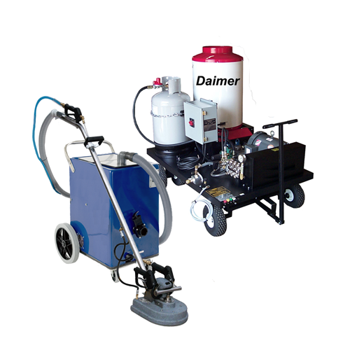 The XTreme Power® HSC 16500 PE is a heated hard surface cleaner with a 9" motorized spinner for commercial industrial use. It combines the versatile Super Max® 12500 PE propane powered and propane fired tri-mode pressure washer and the XTreme Power® 11500 SE sludge extractor. The spinner can be used with hot water temperatures up to 210º F and cleans more efficiently than non-motorized spinners. The XTreme Power® HSC 16500 PE provides steam temperatures of up to 330º F and maintains the high pressure (3000 psi) and flow rate (5 GPM) of the XTreme Power® HSC 16500 GE , yet differs in its operation. This model is powered by a 20 HP propane engine. This heated hard surface cleaner is also ideal for virtually any indoor application including: tile and grout cleaning, marble cleaning, stone cleaning; removing and stripping wax buildup on VCT and vinyl flooring; cleaning rubber floors and other even and uneven hard surfaces that other hard surface cleaners fail to remove. In addition, the 16500 PE heated hard surface cleaner is ideal for those who prefer propane to gasoline.