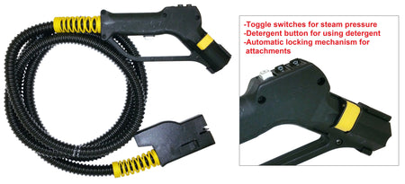 The Steam Hose attaches several different tools and inserts to the machine. The comfortable handgrip is made from flexible, durable plastic and allows for a solid grip while cleaning, along with control over the hose. The steam hose can attach accessories such as extension rods, brushes, and nozzles to the steam cleaner machine. Please see the image to make sure your old hose matches up to the one in the picture. The steam hose is compatible with all KleenJet® 1000 and 3000 steam cleaners. (For the new version of the KleenJet® 1000/3000 models with the new yellow locking tab where the accessories automatically lock into place. If you have the older style "slide to lock tab" where you manually have to lock the attachments together, this will not work!)