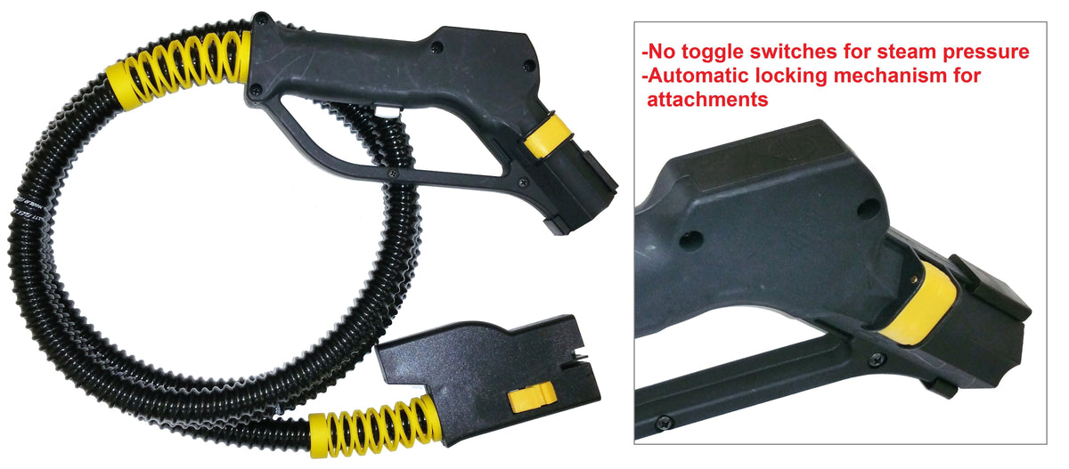 The steam hose with handgrip allows for brushes and other attachments such as squeegees and extension rods to be connected to the machine. The handgrip provides a comfortable control over the hose. Please see the image to make sure your old hose matches up to the one in the picture. (For KleenJet® 200, 300, and 500 models with an automatically locking mechanism and have the steam adjustment knob on the machine)